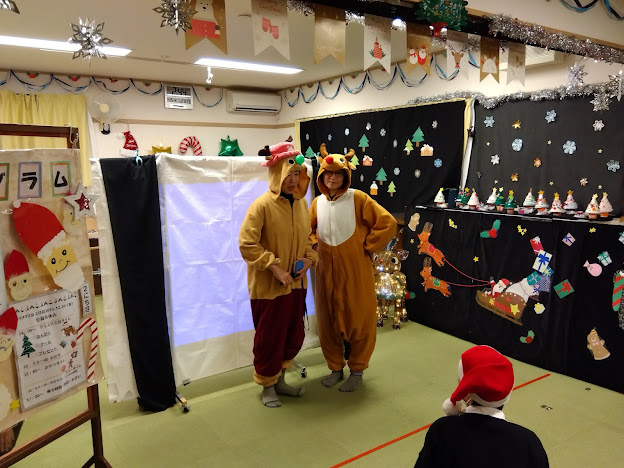 うごき担当によるプログラムでは、ゆかいなトナカイさん2匹が楽しいゲームをしたくれました!影絵当てクイズでは、「くつ~!」「ながぐつ~!」「ブーツ!」などとそれぞれ思った答えをみんな元気に答えてくれました!他にもプレゼントの種をうちわであおいで、トナカイさんの運ぶソリに入れるゲームなどなど、とっても盛り上がりました♪
