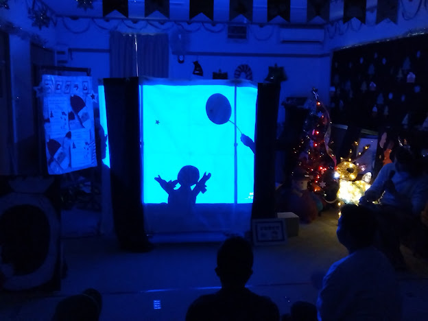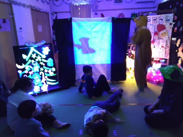 その後は、『パパ!お月さまとって』の読み聞かせもありました。スタッフが手作りしたパパ!お月さまとっての影絵と、『月の光』という素敵なピアノに合わせて読み聞かせを聞いたり、ペンライトをゆっくり振りながら『きよしこの夜』をみんなで歌ったりしました。すごく素敵な演出にみんなでまったりと落ち着いた雰囲気になっていました☆